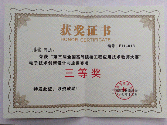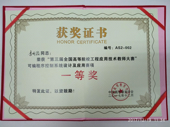 12月17日,在由中国高等教育学会举办的“第三届全国高等院校工程应用技术教师大赛”决赛中,公司信控系李听团和姜雷两位老师,分别获得了“可编程序控制系统设计及应用赛项”一等奖和“电子技术创新设计及应用赛项”三等奖的好成绩。