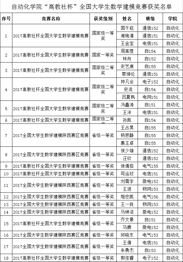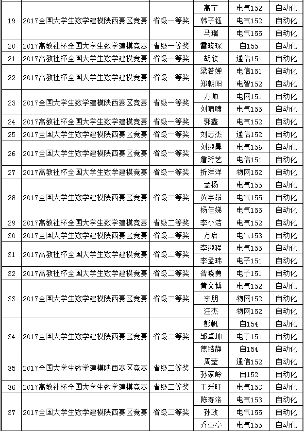 近日,2017年“高教社杯”全国老员工数学建模成绩揭晓,公司本科生数学建模参赛队再创佳绩,共获全国一等奖2项,全国二等奖4项,陕西省一等奖20项,省级二等奖11项,获奖总人次65人,占比公司获奖38.69%。