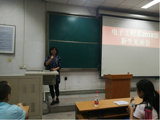 余宁梅教授代表全系师生对2018级全体新生的到来表示热烈的欢迎,并对电子学科及我系发展的历史、团队队伍、办学条件、人才培养等方面的情况为新生们进行了详细解读,希望大家在大学期间都能够成长、发展、成才。余宁梅教授还和新生进行了现场互动,回答了新生们关于专业和学习方面的问题,会场气氛热烈。接着杨莺老师为本科生详细的介绍了我系相关专业学分要求、课程设置、选课要求和方法等情况。最后,系实验中心主任李世光老师对系相关的实验室设置、实验设备等情况作了详细介绍,希望全体新生在理论课学习的基础上,充分利用学习、公司以及系里提供的实验资源与平台,努力提升自己的实验及动手能力。