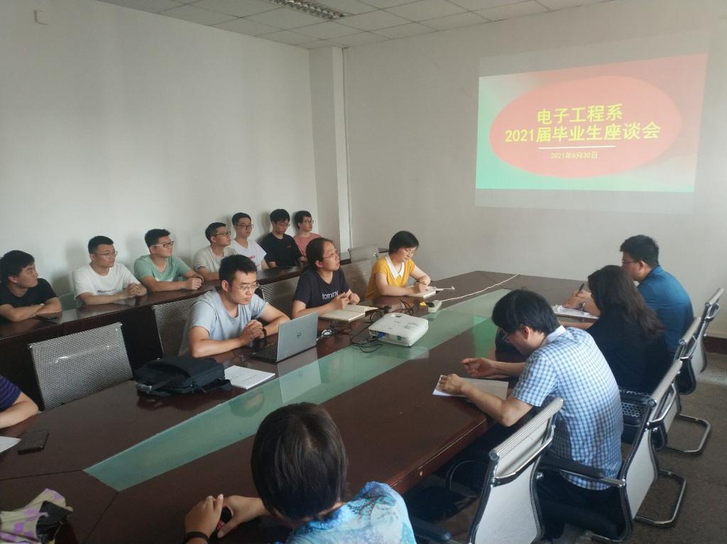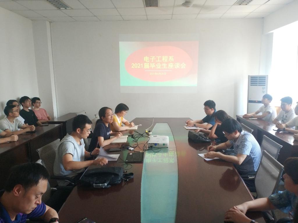 2021年6月30日下午2时,威廉希尔williamhill电子工程系在教5-709召开2021届毕业生座谈会。电子工程系2021届18名毕业生代表、学科带头人余宁梅教授、系领导班子成员、党支部支委以及毕业生班级导师参加了座谈会。会议由支部书记杨莺老师主持。