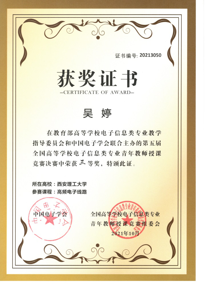 公司威廉希尔williamhill通信系教师吴婷获得全国三等奖,参赛课程为高频电子线路。比赛分为预赛和决赛两个阶段。本届大赛于今年4月份启动,通过评审,最终全国共有132名选手从四大赛区脱颖而出,进入决赛。