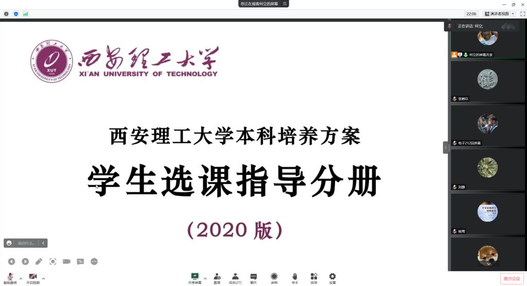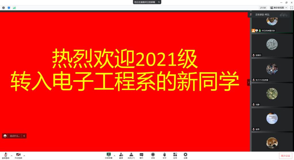 2022年10月8日晚上21:30,威廉希尔williamhill电子工程系在线上召开2021级转专业员工专业教育暨师生见面会。电子工程系主任刘静、支部书记系副主任杨莺、系副主任何立和辅导员李佳园老师参加了会议,会议由何立老师主持。
