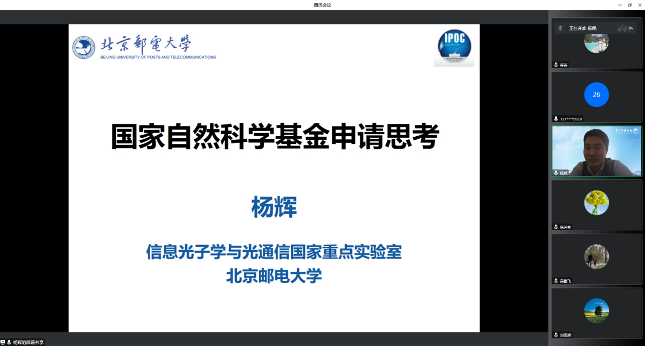 杨辉教授结合自身申报国家基金的经验,首先对国家自然科学基金准备的时间、领域、定位、问题、创新、价值及必要性做了详解,然后从项目申请书的题目、摘要、立项依据、研究内容、研究目标、关键科学问题、研究方案及可行性分析、特色和创新之处、研究基础及项目经费与其他事项等方面给出了具体的撰写建议和注意细节,也总结了自己作为评审人在同行函评过程中的一些感想,以及需要规避的常见错误。杨教授希望大家在吃透申报指南的基础上对申请书进行反复凝练、修改打磨。最后,杨教授分享了自己申请国家优青的经验,鼓励大家积极申报人才类项目。