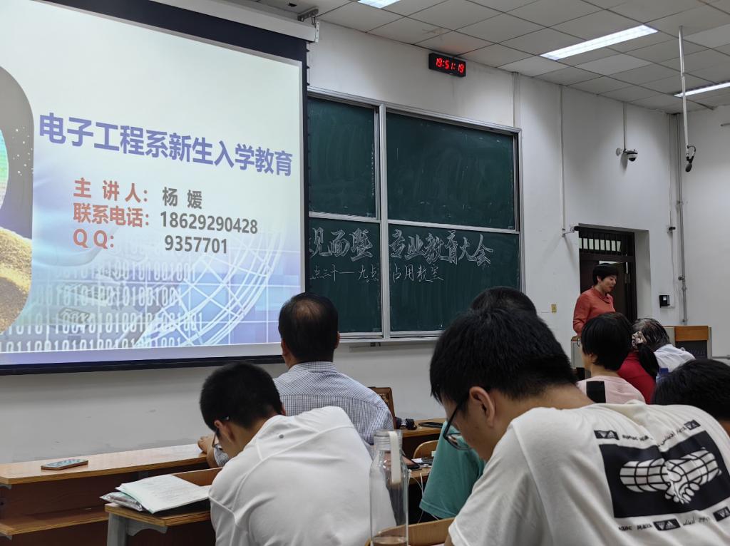 学科带头人杨媛教授首先介绍了电子工程系的团队建设和专业发展情况,同时为本科新生做了精彩的专业科普报告;然后结合当前国际集成电路相关时事激励员工努力学习以助力我国半导体行业发展;最后,从专业学习角度对本科生提出了几点建议和要求。
