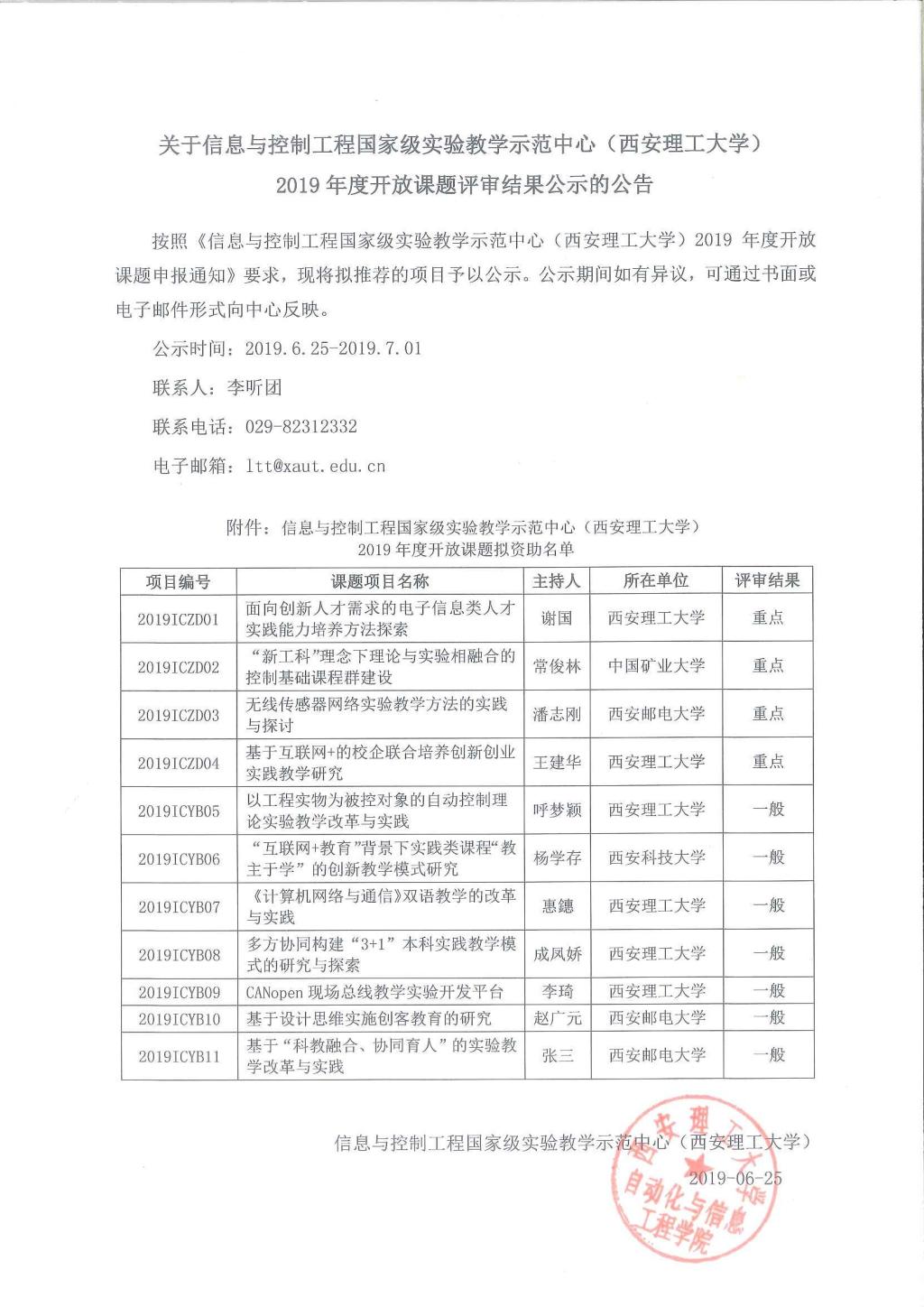 关于信息与控制工程国家级实验教学示范中心(威廉希尔)2019年度开放课题评审结果公示的公告
